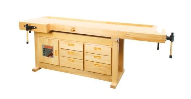 Her har du en allsidig høvelbenk som er laget i flott bøketre av Tysk kvalitet! Denne benken vil være et flott alternativ i boder og garasjer hvor man ikke har så mye plass, siden arbeidsflaten kan klappes sammen når den ikke er i bruk. Du har også to hendige skuffer som kan brukes til oppbevaring av materialer og verktøy, og du kan bruke toppen som en hylle. Det er også en liten hylle mellom skuffene, som vi syntes er svært praktisk! På benkeplaten finner du to stikker for festing av arbeidsemner. Benken veier ca 56 kilo, og er 1200 mm høy, 1230 mm lang og 770 mm dyp. Dette vil være en flott benk både til voksne og barn!