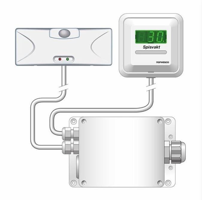 Komfyrvakten jobber på to måter for å holde hjemmet trygt. Den har en innebygd timerfunksjon som starter når temperaturen på platetoppen når 100 grader. Etter to timer slås strømmen automatisk av, selv om det ikke har oppstått noen farlig situasjon. Dette er nyttig hvis du glemmer at du har noe på komfyren. Trenger du lengre koketid, kan du enkelt forlenge bruken ved å trykke på knappen hver halvtime.