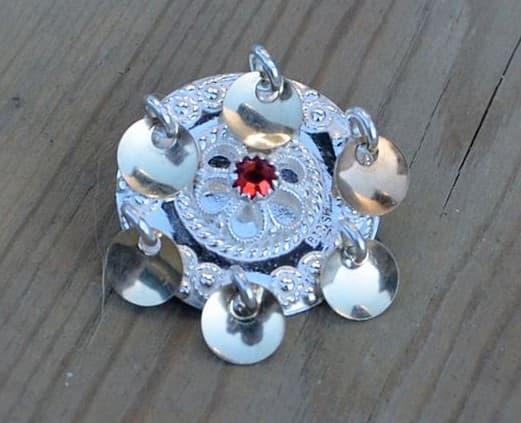Vi starter med en søt sølje som er 3,8 cm x 4,2 cm stor. Den har vakre detaljer i midden, og tau-bord rundt, og den har 6 løv. I midten av søljen finner du en liten sten – og denne stenen kan du selv velge farge på! Dermed blir dette en barnesølje som har det lille ekstra, og som blir litt ekstra personlig. Velg mellom fargene lilla, rød, grønn, eller blå. Du kan også velge å ha søljen uten sten. Denne modellen kan også brukes som halssølje når barnet blir større.
